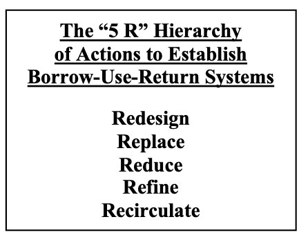 Borrow-use-return systems expand on what is called the ‘closed-loop’ economic approach by focusing on the material extraction phase, not just production, reuse, and recycling. In practice, it involves working with local private, non-profit, and public organizations to implement five core actions: redesign, replace, reduce, refine, and recirculate.